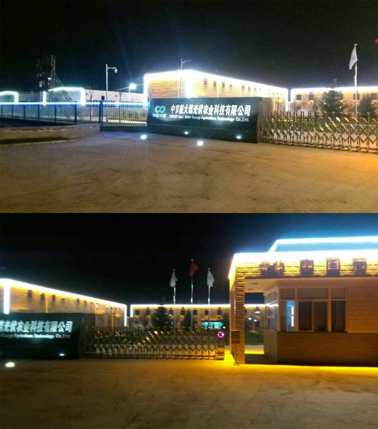 簡介—— 中節能大荔光伏農業科技有限公司廠區亮化項目,是我們陜西蘭光照明2015年承接的亮化工程。公司設計師根據廠家要求簡單實用的特點,整個廠區的設計全部采用線條燈和輪廓燈,將整個廠區的廠房、大門、廠區道路、辦公樓以輪廓勾勒的形式展現出來,照亮整個廠區,達到客戶廠區樓宇亮化需求。